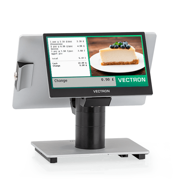 Vectron C100 má obrazovku s úhlopříčkou 26,4 cm (10,4 "). Jako doplněk k zobrazení objednávek display zobrazuje loga a reklamní prezentace, které komfortně ovládáte z pokladny. Prezentaci můžete zobrazit na celé obrazovce nebo rozdělíte display na reklamní část a registrační část, kde zobrazuje probíhající markování.